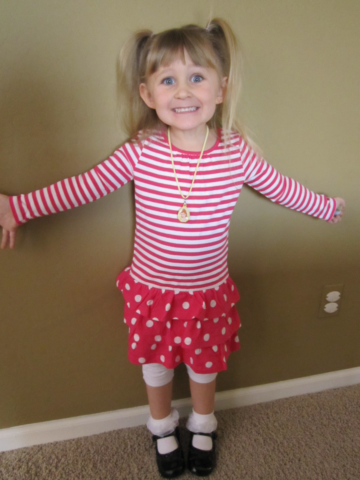 Sydney loves to dress up now. She always wants to have jewelry on and bright, colorful clothes! She will often disappear into her bedroom and reappear with some very interesting outfits on!!